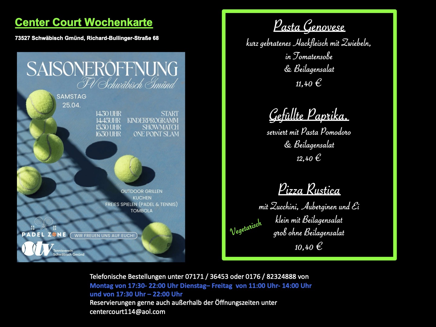Das Team Center Court wünscht eine schöne Woche und freut sich auf einen Besuch in unserem Restaurant und auf unserer schönen Terrasse.
