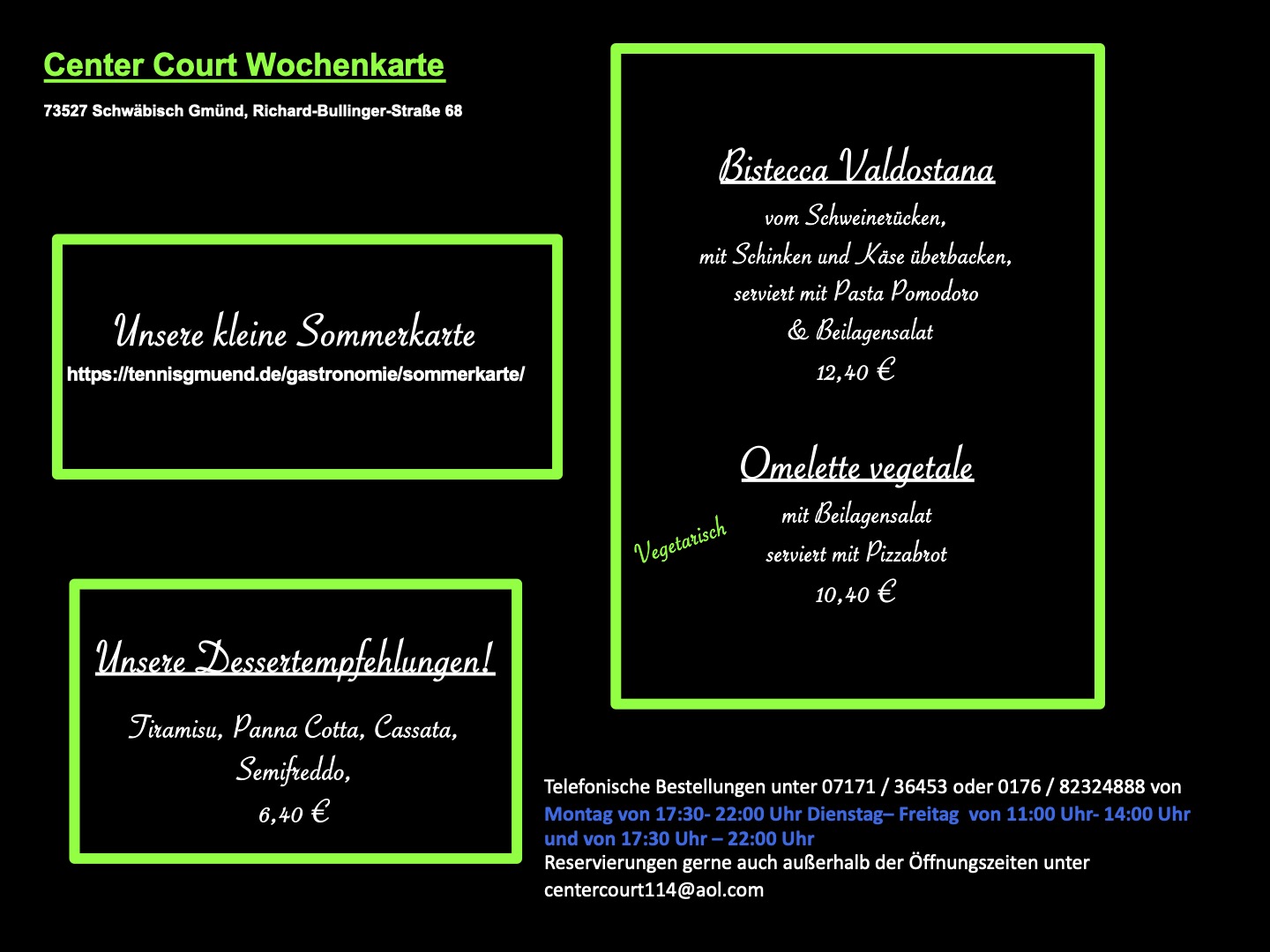 Unsere Speisekarte als Link: https://tennisgmuend.de/gastronomie/sommerkarte/