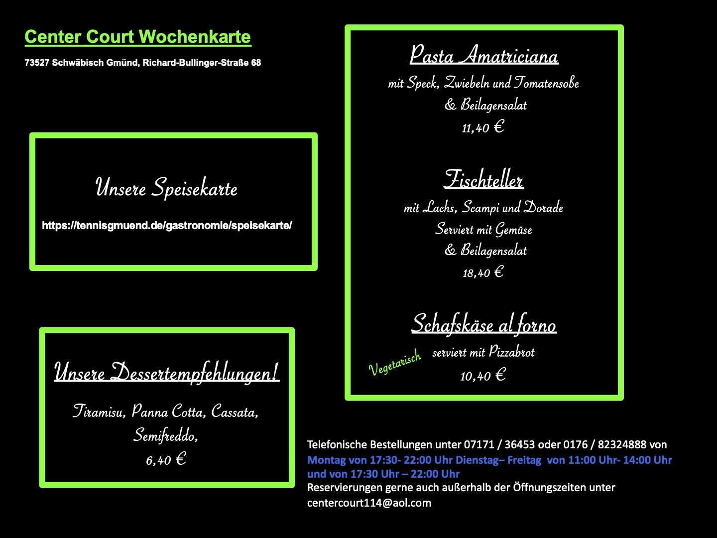 Unsere Speisekarte als Link: https://tennisgmuend.de/gastronomie/speisekarte/